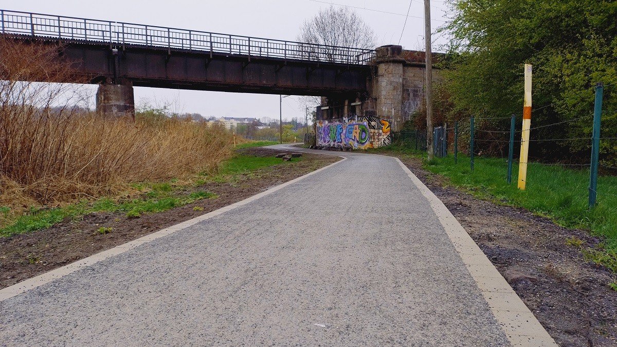 L'ancienne piste cyclable était dans un très mauvais état technique. Les personnes utilisant une aide à la marche étaient contraintes de faire un détour par la Langenberger Str. La couche supérieure, composée de gravats grossiers et instables et largement envahie sur les côtés par l'herbe et les mauvaises herbes, a été remplacée sur toute sa longueur de 800 mètres par une piste cyclable entièrement neuve.