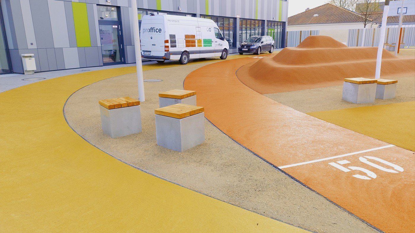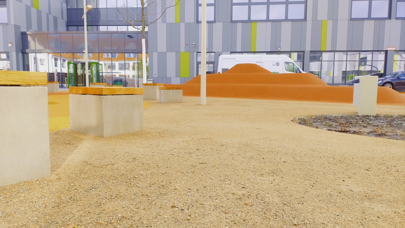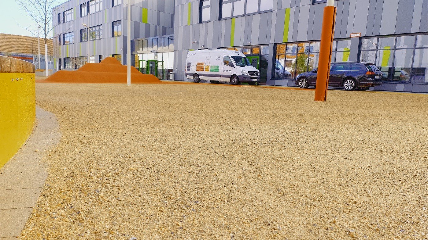 Après les vacances de Pâques 2026, la nouvelle école Peter-Härtling (une école spécialisée de l'arrondissement de Soest) a été inaugurée. En février et mars, le matériau de revêtement routier lié à l'eau KoMex Gelb de Koers a été posé à différents endroits.