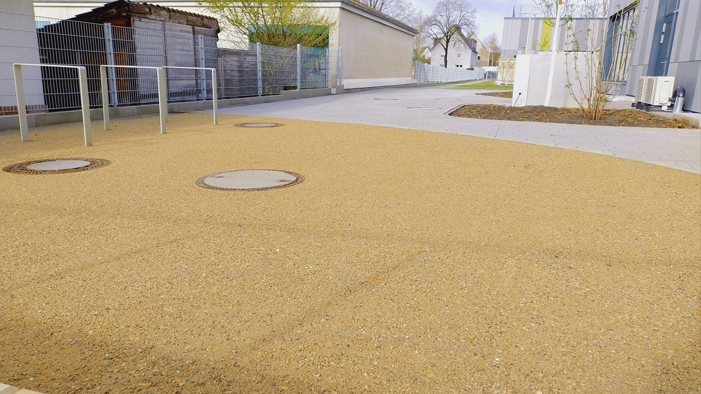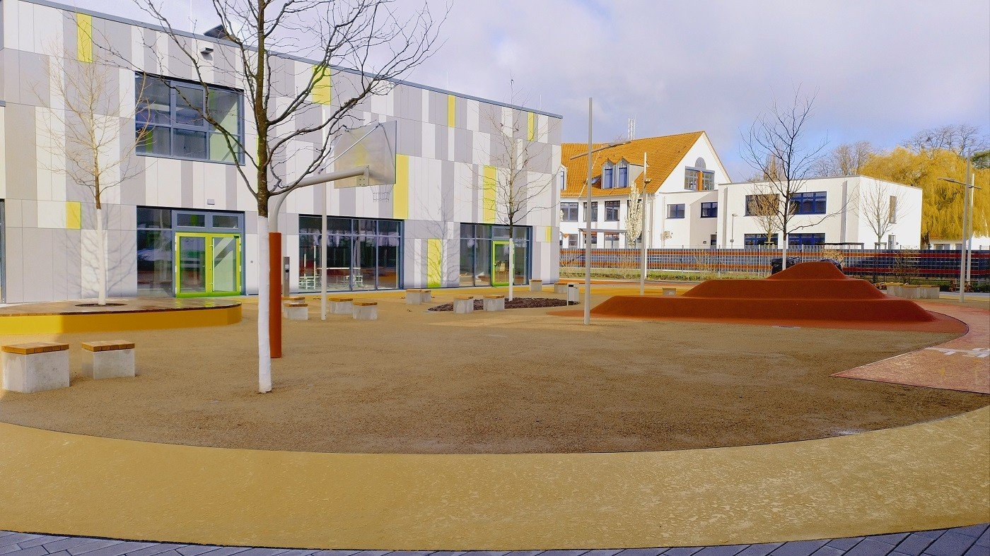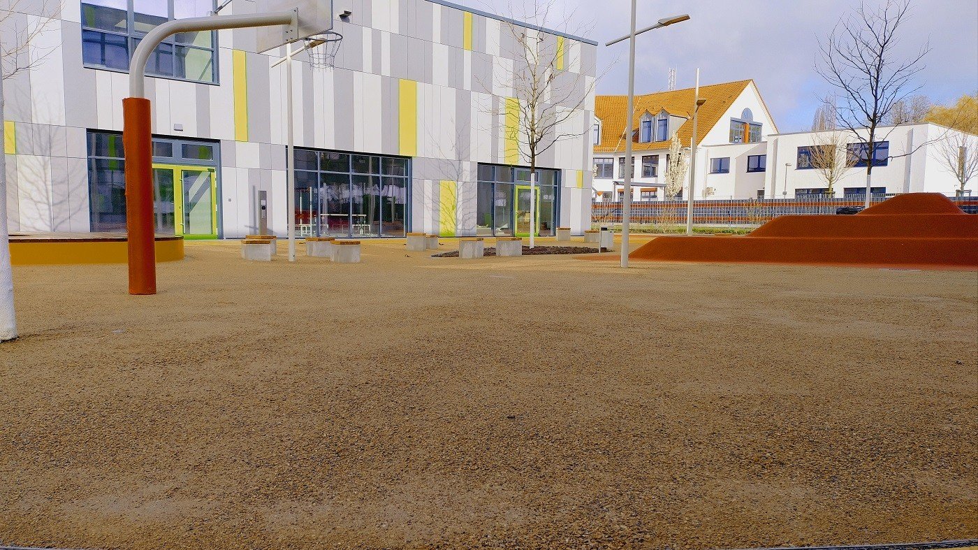 Na de paasvakantie van 2026 vond de feestelijke opening plaats van de nieuwe PeterHärtling-Schule (een school voor speciaal onderwijs van de Kreis Soest). In februari en maart werd op verschillende plekken de waterdoorlatende halfverharding KoMex Geel van Koers aangebracht. KoMex Geel is uiterst onderhoudsvriendelijk en stabiel. Door organische bindmiddelen krijgt KoMex Geel zijn draagkracht. Het materiaal is zowel geschikt voor hellingen als voor paden in overstromingsgebieden. Hier zijn bijzondere details over de buitenruimte van de Peter-Härtling-Schule: